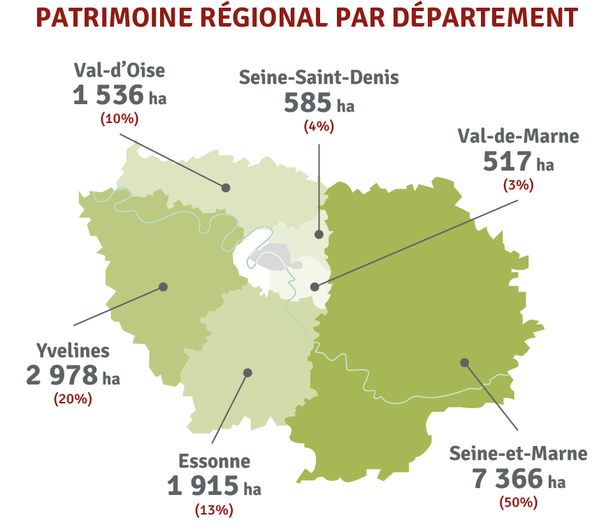 Île-de-France Nature mène une veille foncière et des actions ciblées au sein de 56 Périmètres régionaux d’intervention foncière, regroupant plus de 45 000 hectares, principalement situés dans la ceinture verte.